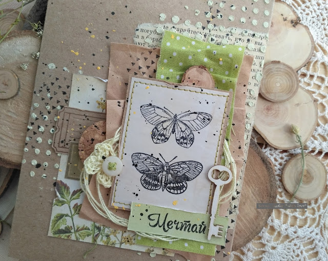 З вами сьогодні Юля, і я хочу показати конверт-листівку. Конверт робила з крафтового паперу, використала трафарет з кружечками, фоновий штамп трикутники, штампи з метеликами - цей і цей, штамп-напис з набору та чіпборд ключик.